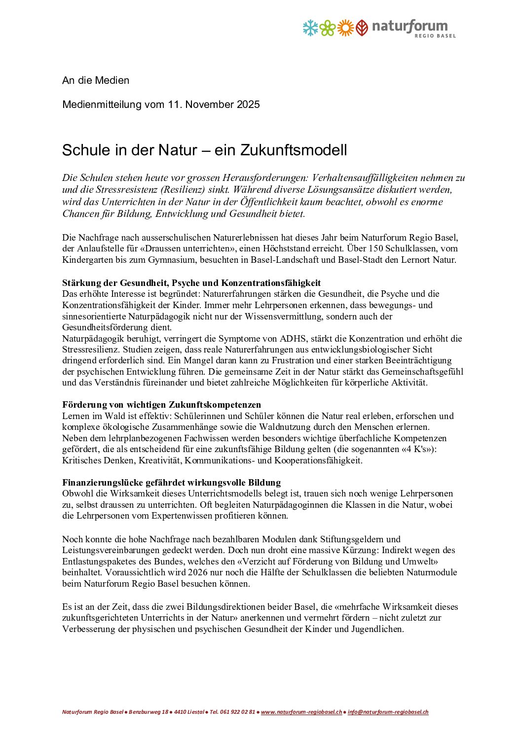 Nachfolgend finden Sie die vom Naturforum Regio Basel publizierten Medienmitteilungen.